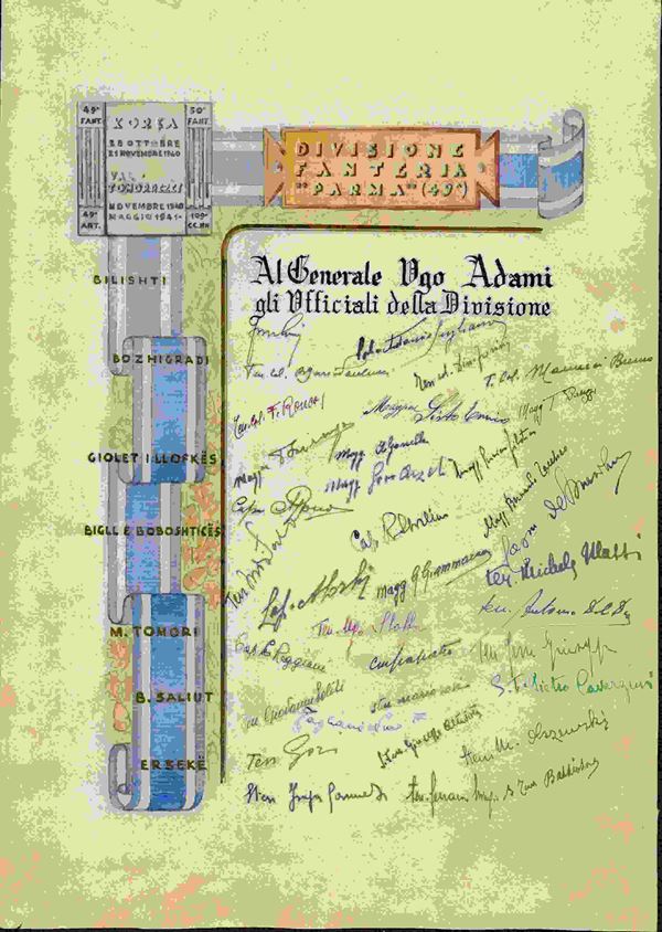 Foglio con dedica a Generale Ugo Adami dagli ufficiali della Fanteria Parma...