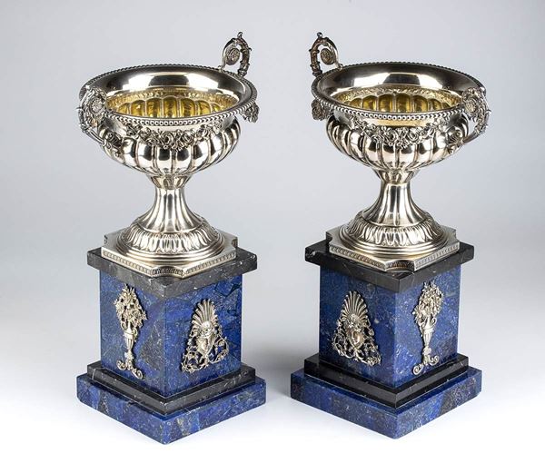 A pair of sterling silver and Lapis lazuli presentation cups on stand - mark of..., Argenti del XX secolo...