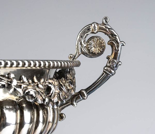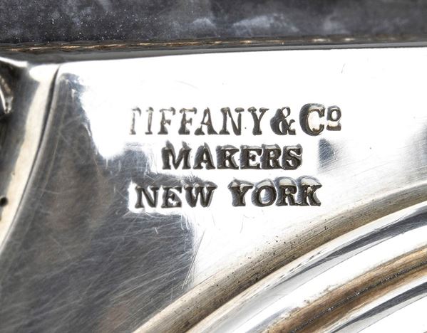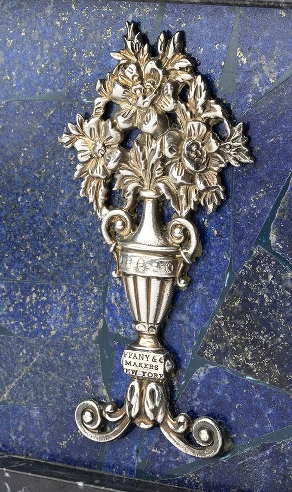 of crater form with side handles and square base, resting on lapis lazuli quadrangular plinths decorated on the sides with applications depicting female heads surrounded by vine shoots and vine leaves. Sterling silver 925/1000, hallmarked "Tiffany & Co - Makers - New York.
