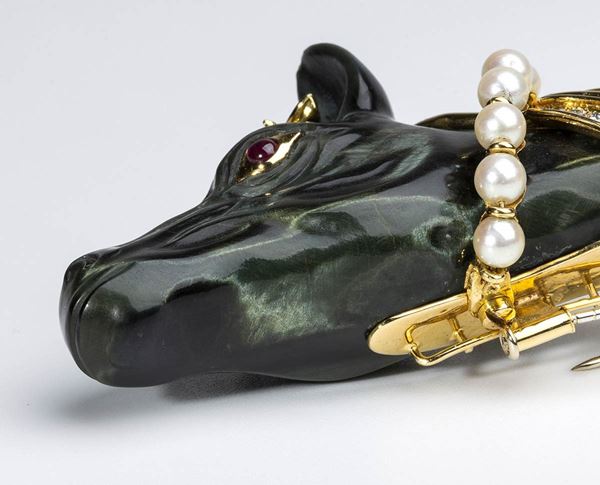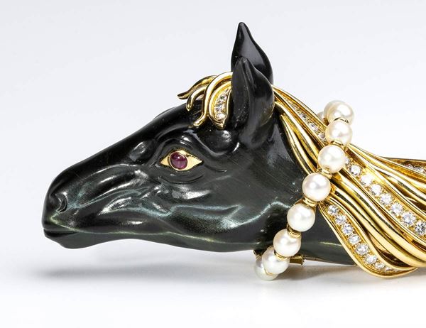 feraturing an horse head made of carved chrysoberyl chatoyand, 18k yellow gold mane highlighted by round brilliant cut diamonds ca. 2.60 ct, G, VVS-VS, eyes in small rubies, saltwater cultured pearl necklace around the horse's neck.