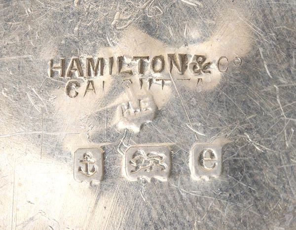 of circular shape. Sterling silver, fully hallmarked Birmingham 1904-1905, silversmith Harry Emanuel. It bears the inscription "Calcutta" and the silversmith's signature "Hamilton & Cรฒ", indicating that it was produced in the British colony of Calcutta.