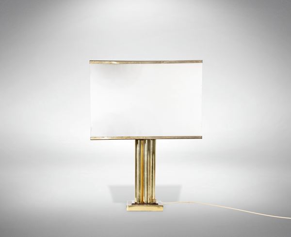 Brass and plexiglass lamp.Signature "Romeo Rega" engraved on side.Hollywood Regency Style, in very good condition.