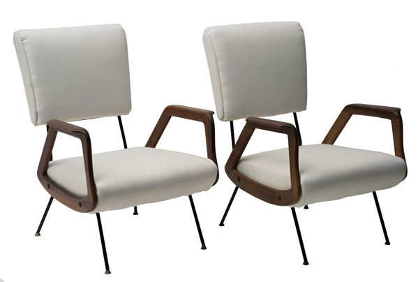 armchairs with structure in painted metal and brass, wooden armrests, upholstery covered in fabric