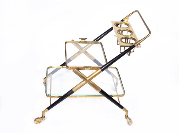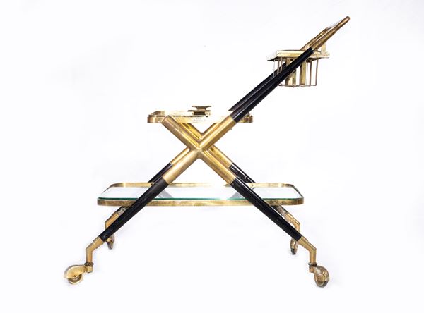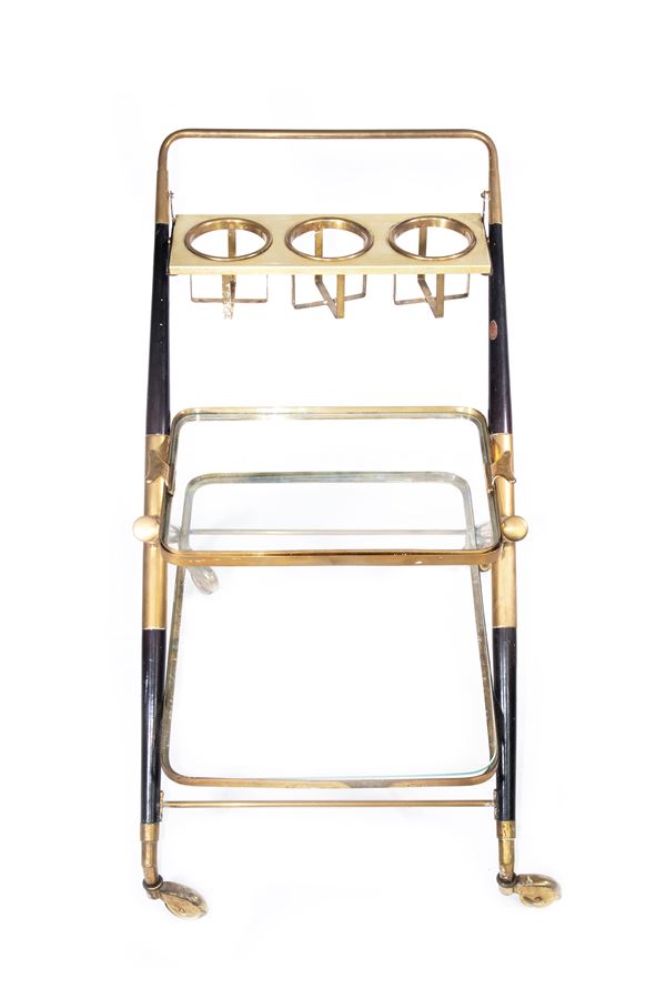 Black wooden and brass bar Cart with glass shelves. Mint condition.