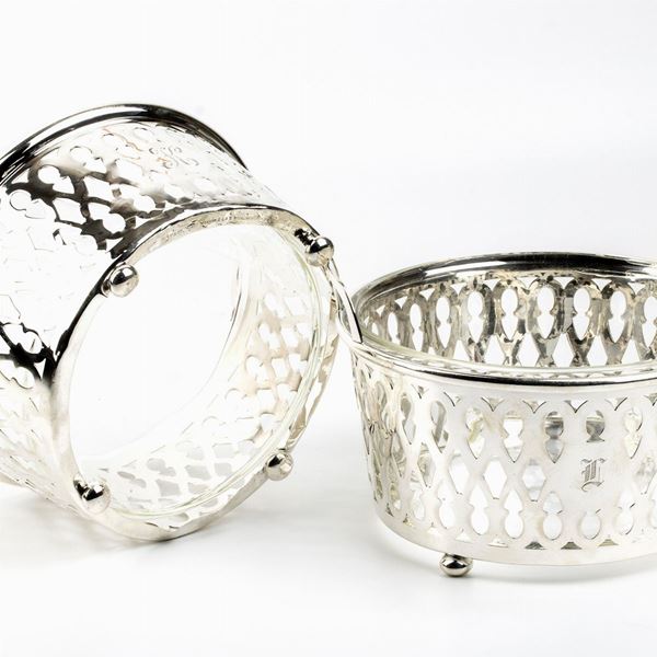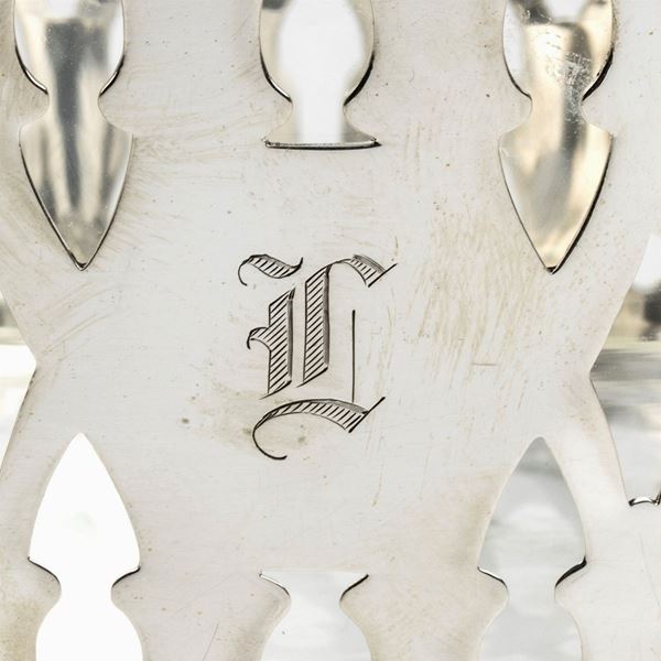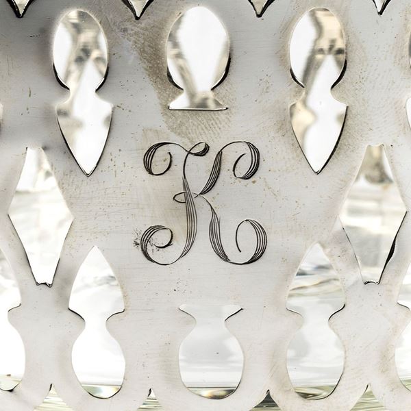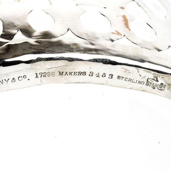 of circular form with side handles, openwork body resting on four spherical feet, transparent glass containers. Sterling silver, hallmarked "Tiffany & Co - 77298 - makers 7674 - Sterling Silver 925-1000", silversmith Tiffany & Co, 1907-1947 (directorship of John C. Moore II).