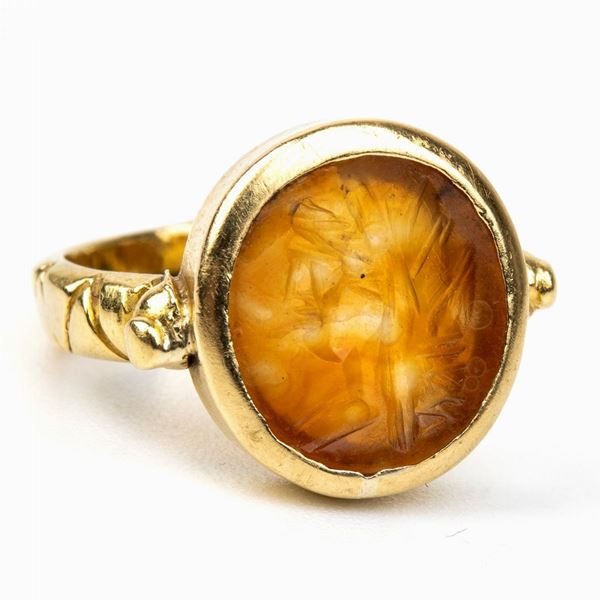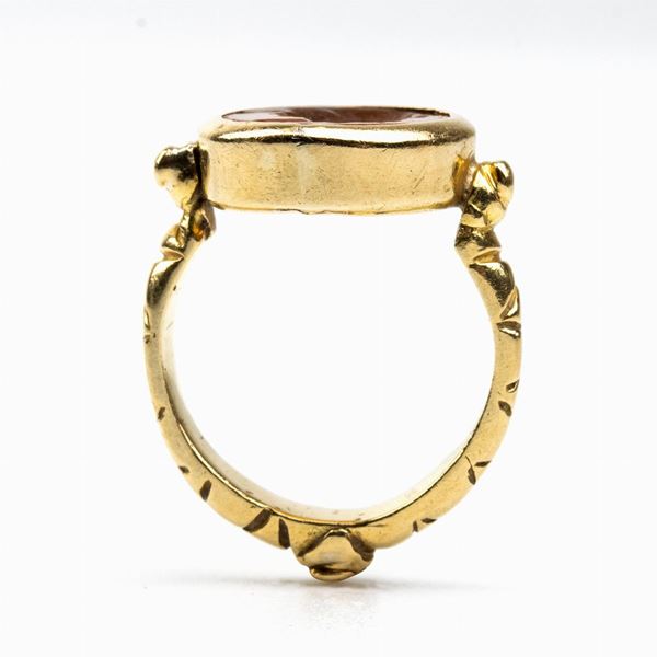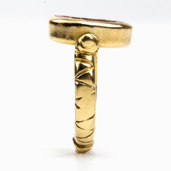 oval shaped carnelian intaglio depicting a female profile, yellow gold mounting.