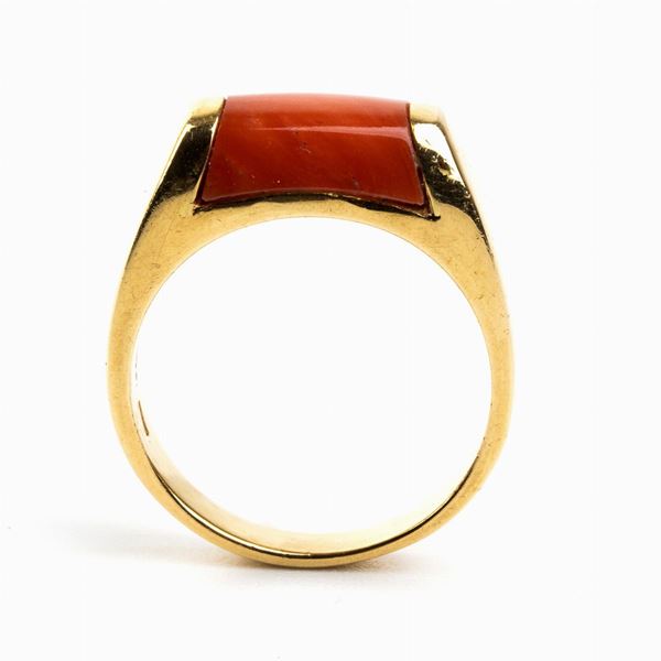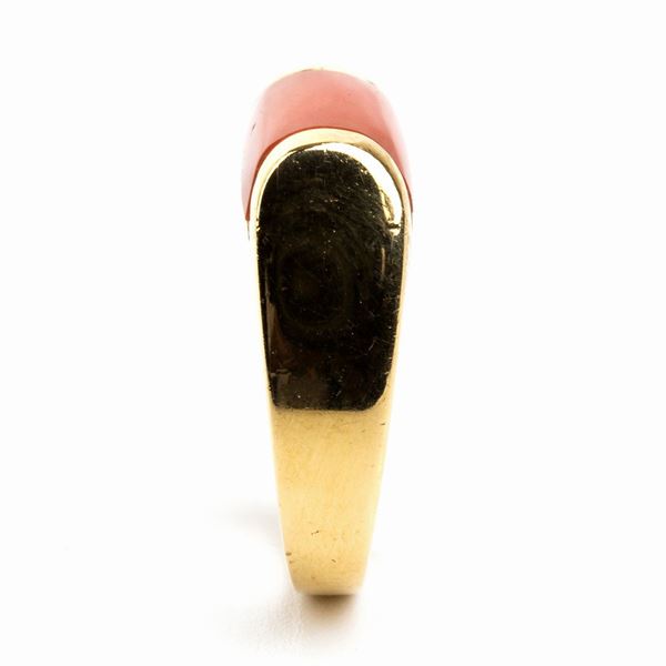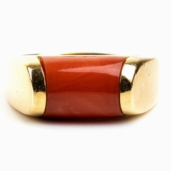 18k yellow gold. Set with cerasuolo coral (corallium elatius). Signed "BVLGARI". Hallmarked "1970 AL - 750".