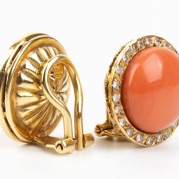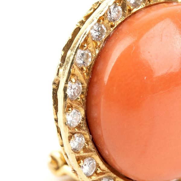 set with cabochon cut cerasuolo coral (corallium elatius) framed by diamonds. 42 round shape, brilliant cut diamonds, approx. 0.60 ct, G - H , VVS.