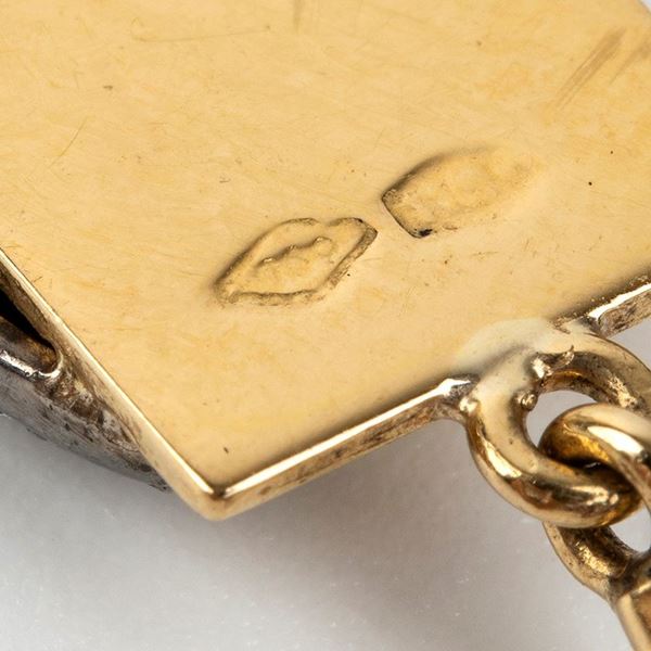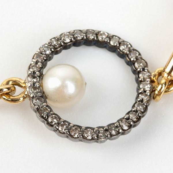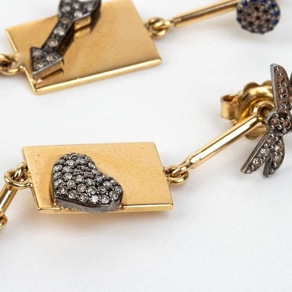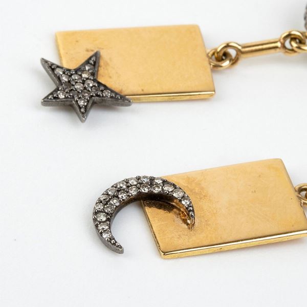 18k yellow and white gold, geometric elements line, star, heart, moon and arrow motifs in pave set diamonds, small saltwater cultured pearls and sapphire details. Round shape huit-huit cut diamonds approx. 0.25 ct, G-H, VS. Round shape composite cut sapphires 0.25 ct. Hallmarked "750 - 1979 AL".