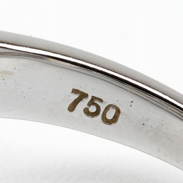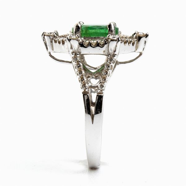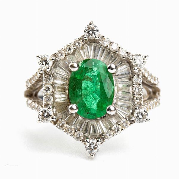 18k white gold, set with emerald framed by diamonds. Round shape brilliant cut, rectangular and tapered shape step cut diamonds, approx. 1.80 ct, G-H, VVS-VS. Oval shape composite cut emerald approx. 1.20 ct. Hallmarked "750".
