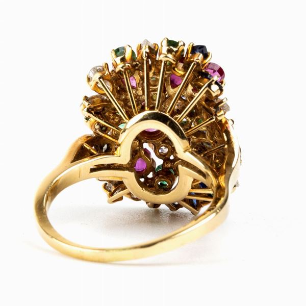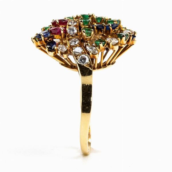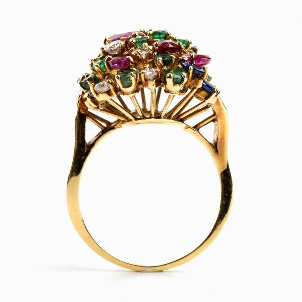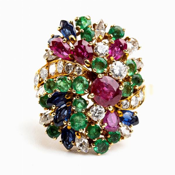 floral pattern set with round shape, brillant cut diamonds, approx 1.60 ct, G - H, VVS; pear shape, composite cut rubies, approx. 1.50 ct; round shape, composite cut emeralds, approx. 1.30 ct.