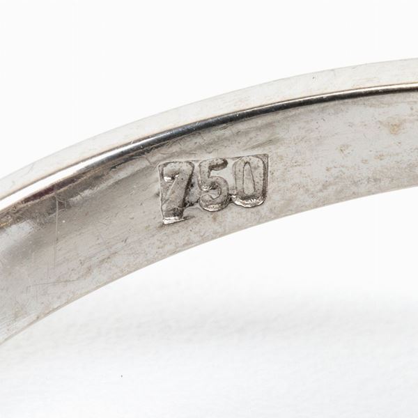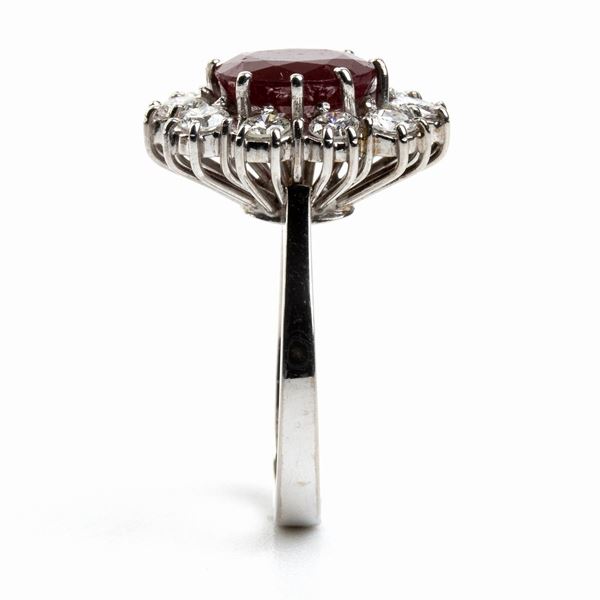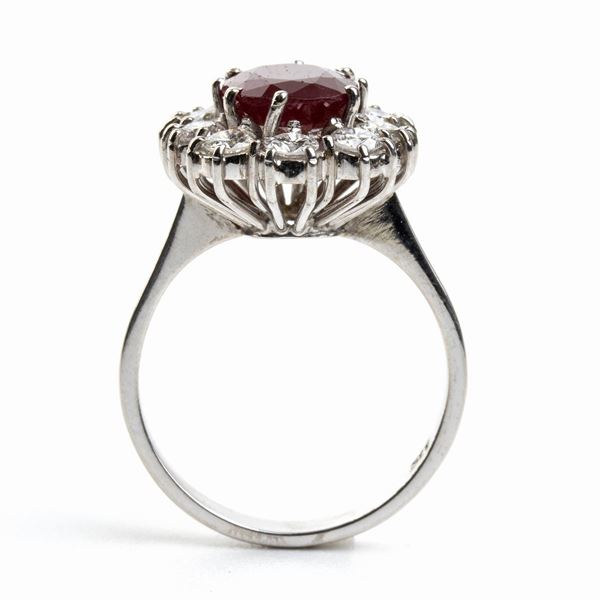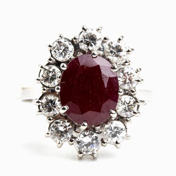 18k white gold, set with ruby framed by diamonds. N. 10 round shape, brilliant cut diamonds approx. 1.00 ct, G-H, VVS-VS. Hallmarked "750".