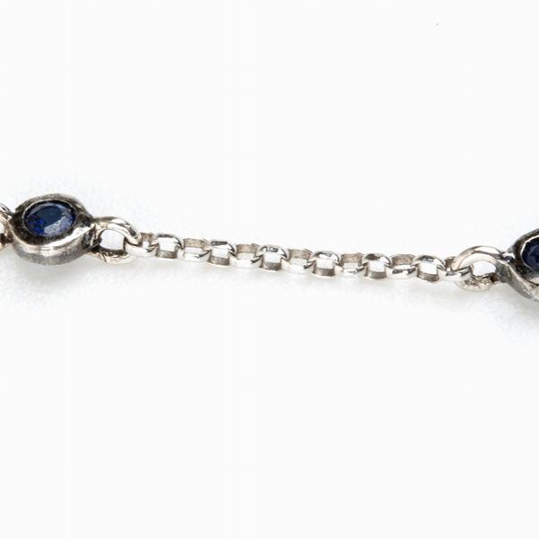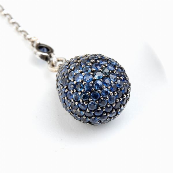 18k white gold, with drop pendant paved with sapphires. No. 02 round brilliant-cut diamonds approx. 0.06 ct. Composite-cut round sapphires approx. 5.00 ct. Hallmarked "750".