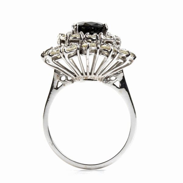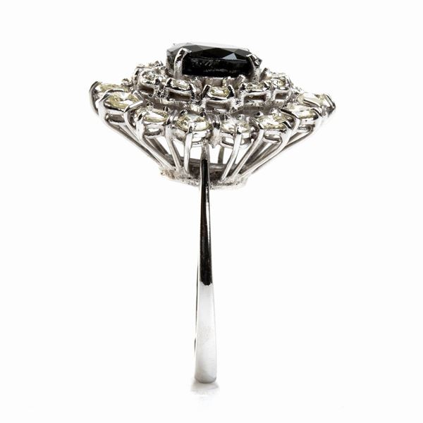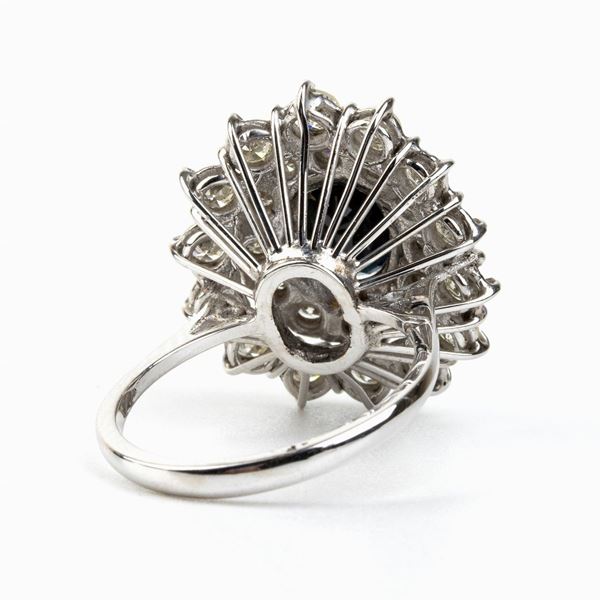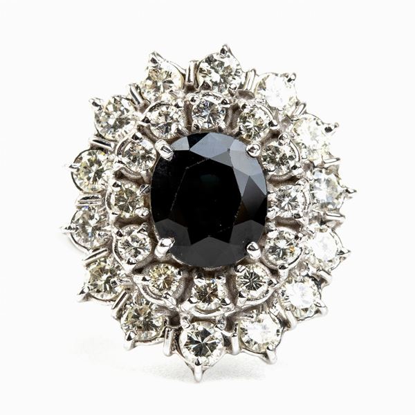 with blue sapphire set between a double diamond frame. N. 26 round shape, brilliant cut diamonds, approx. 2.10 ct, G-H, VVS- VS. N. 01 blue sapphire oval shape, composite cut, approx 3.10 ct.