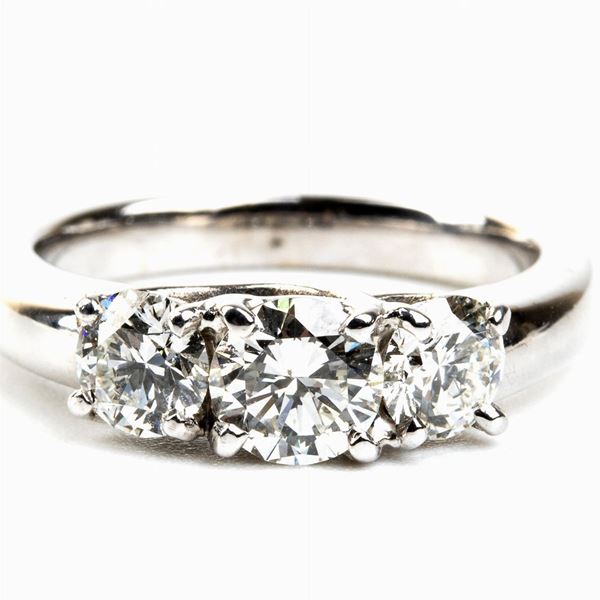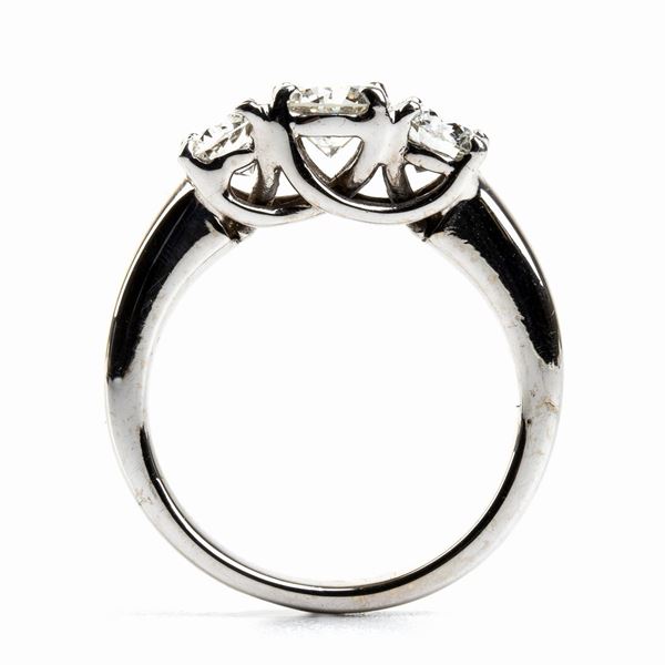 18k white gold, set with 3 round shape brilliant cut diamonds approx. 0.65 ct = 0.40 ct + 0.40 ct, F-G, VVS.