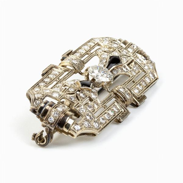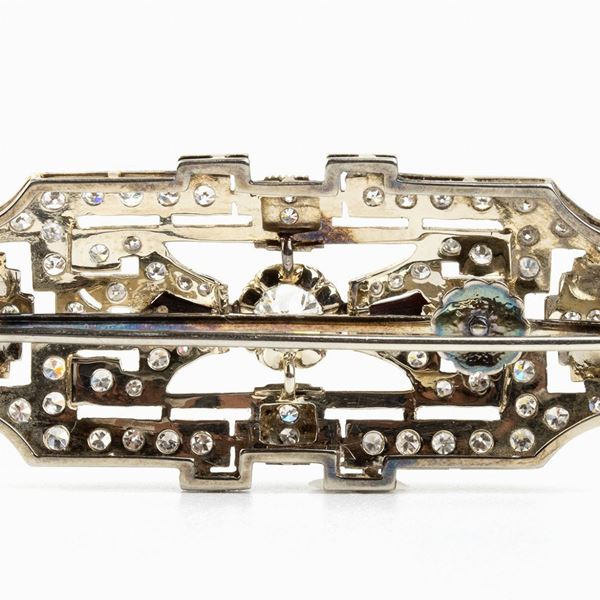 openwork plate with geometric motifs in the shape of a lozenge, set with diamonds. N. 01 round shape old mine cut diamond approx. 0.80 ct, I-J, VS. Round shape huit-huit cut diamonds approx. 1.60 ct, G-H, VVS-VS.