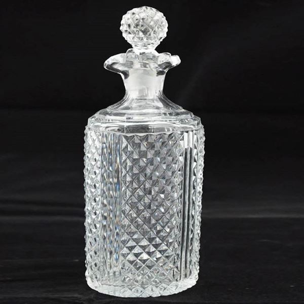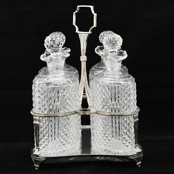 with four beautifully engraved decanters in the classic English style. The stand is centered with a large carrying handle. Sterling silver, fully hallmarked London 1806-1807, silversmith Napthali Hart.
