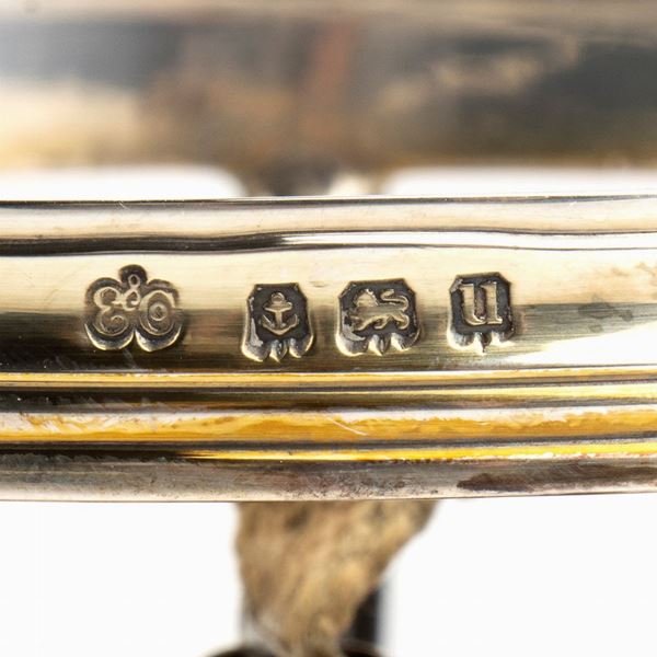 of circular shape with body, resting on a stand with three foliate feet and a burner. Sterling silver, fully hallmarked Birmingham 1919-1920, silversmith George Lambert.
