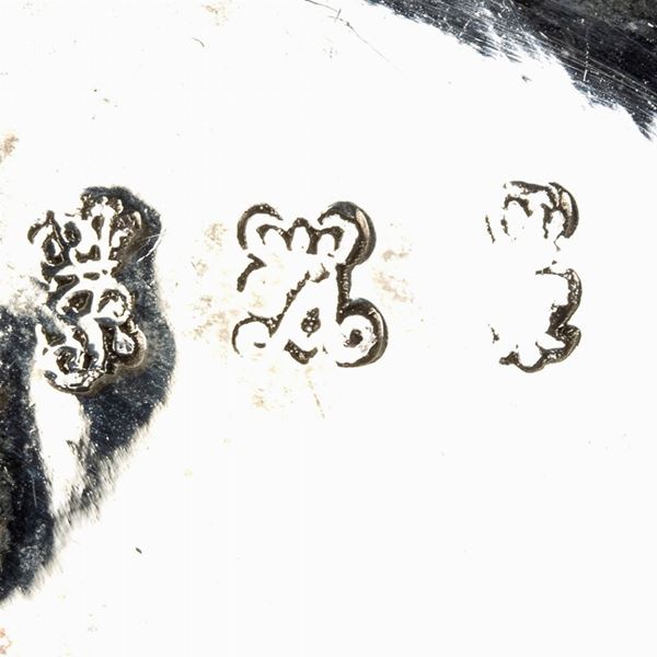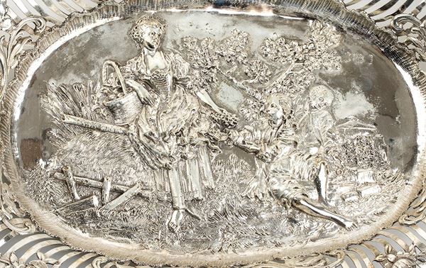 of oval form with side handles, entirely decorated with courtly scenes and landscapes. Hallmarked with the hallmarks in use in Hanau, silversmith Georg Roth & Co. (Hanauer Silberwaren-Manufaktur), in business since 1891.