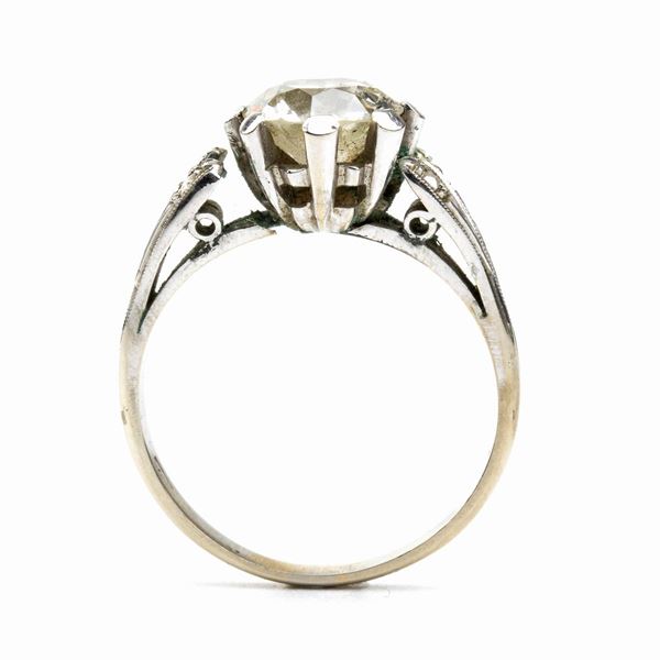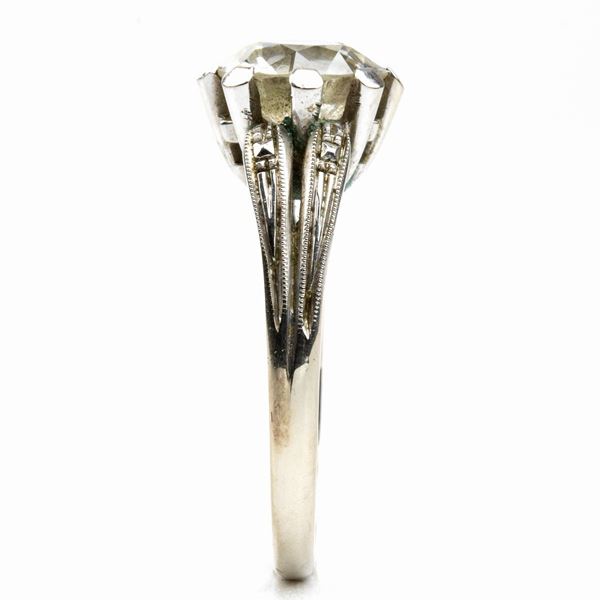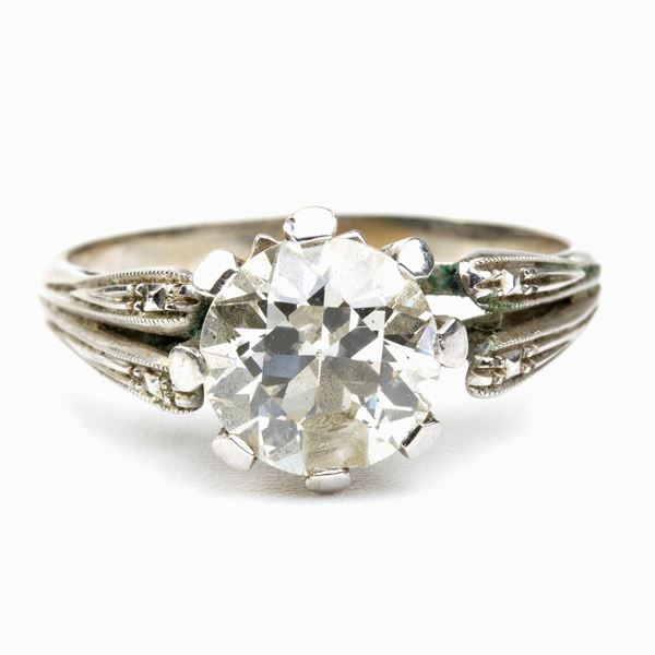 18k white gold, set with diamond. Round shape, old mine cut diamond approx. 2.20 ct, J - K color, I clarity. Hallmarked "750".
