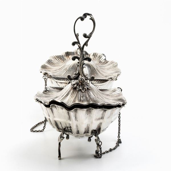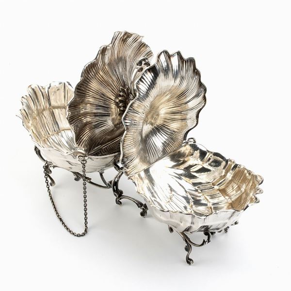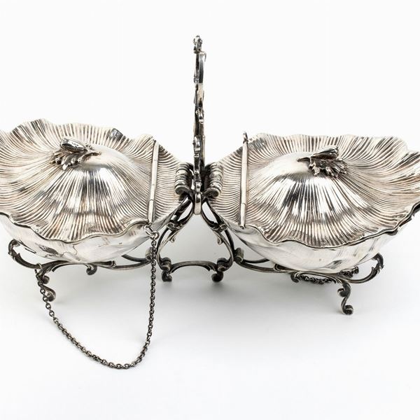 of shaped form with two side containers, leaf-shaped hinged lids.