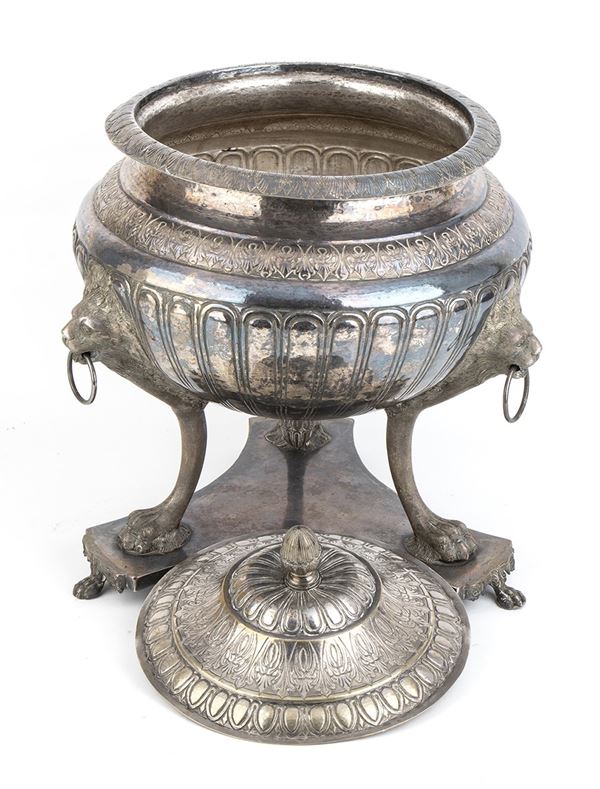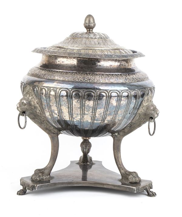 circular fluted body decorated with three lion heads, resting on three claw feet on a tripod base. Duomed lid with pine cone final. 800/1000 silver, hallmarked with the mark in use by the guild of goldsmiths of Naples for silver objects with a title of 833/1000 or 10 ounces, 1832-1872.