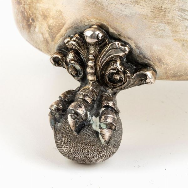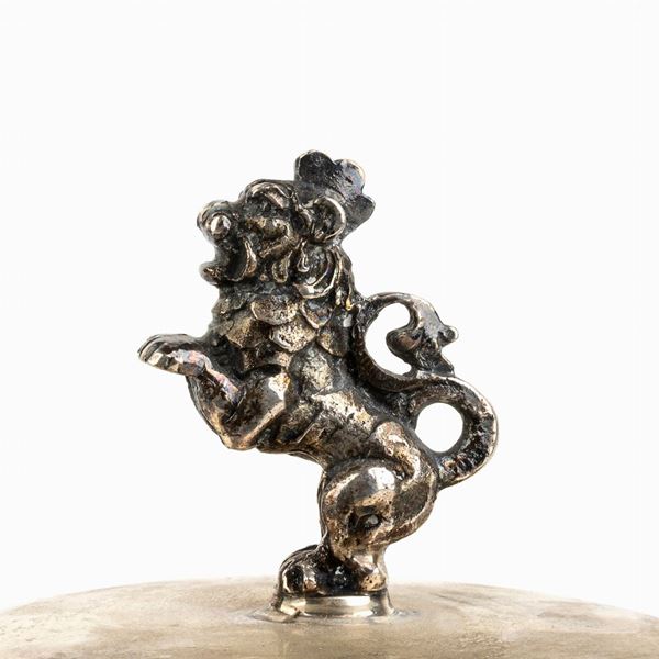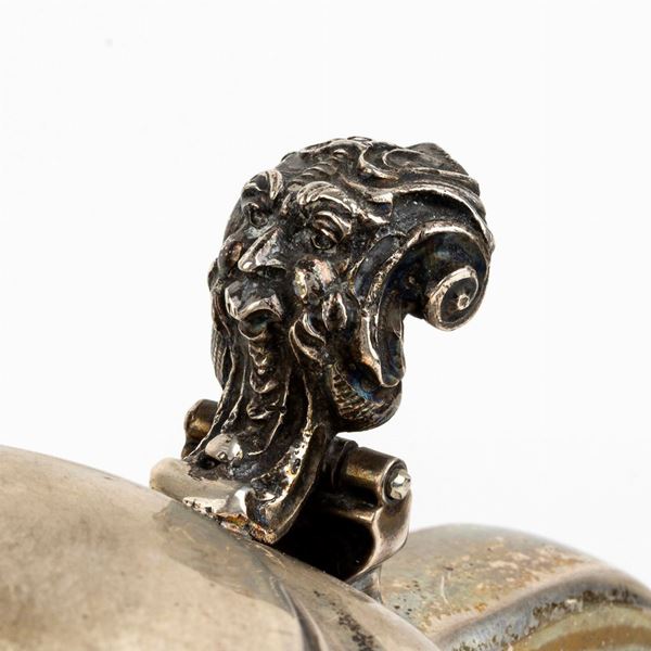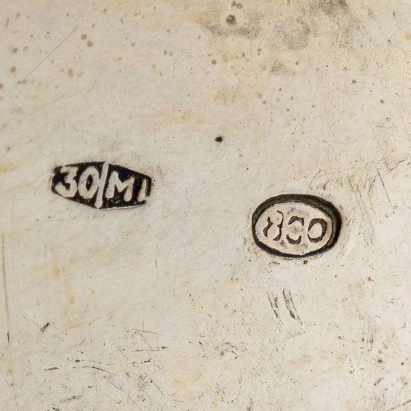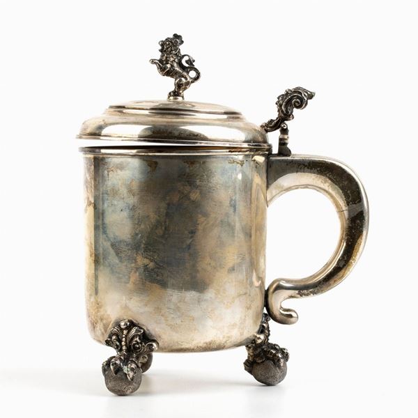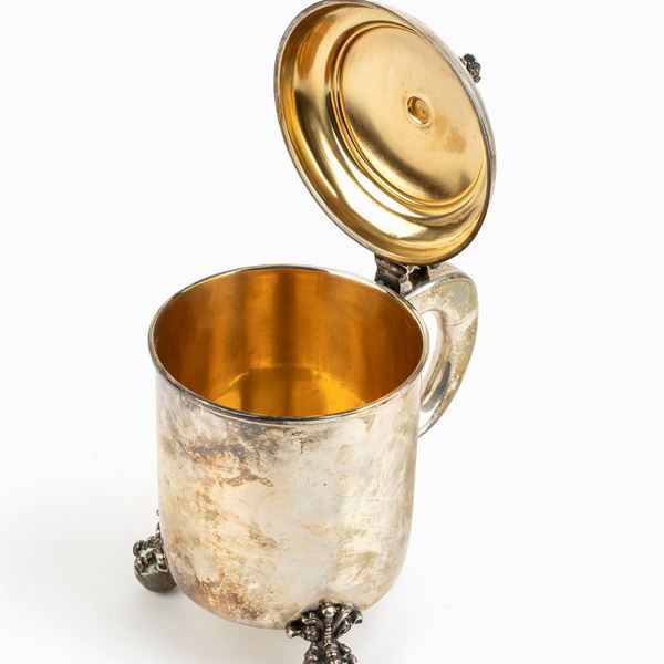 smooth cylindrical body resting on three claw and ball feet, backthumb piece and final in the form of a lion rampant. 800/1000 silver , hallmarked with Fascist-party "30 beams MI" in use in Milan from 1935 to 1945, silversmith Malinverni Umberto.