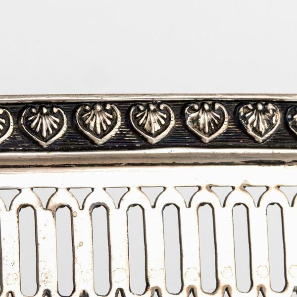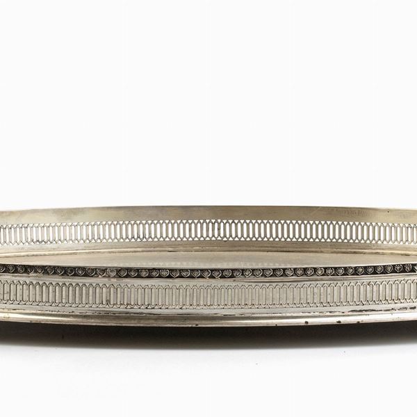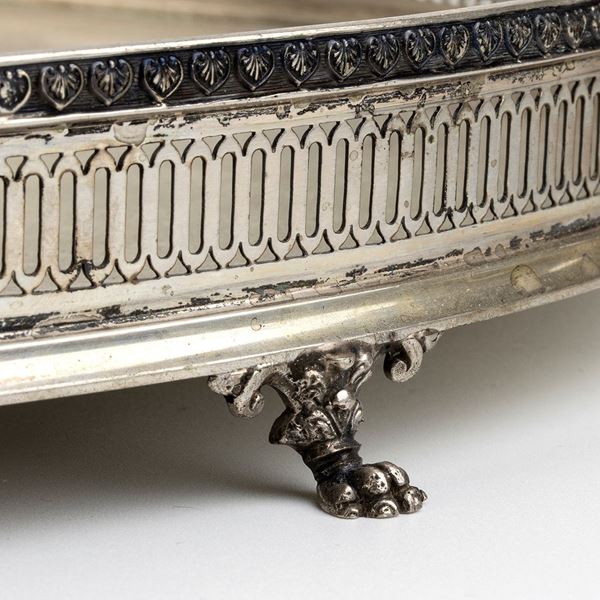 of oval form with railing resting on ferine feet. 800/1000 silver, hallmarked "800" and "176 FI", silversmith Pampaloni Ermindo.