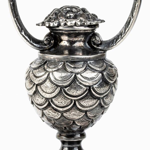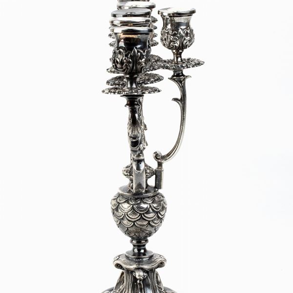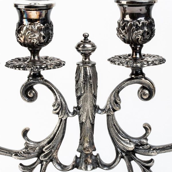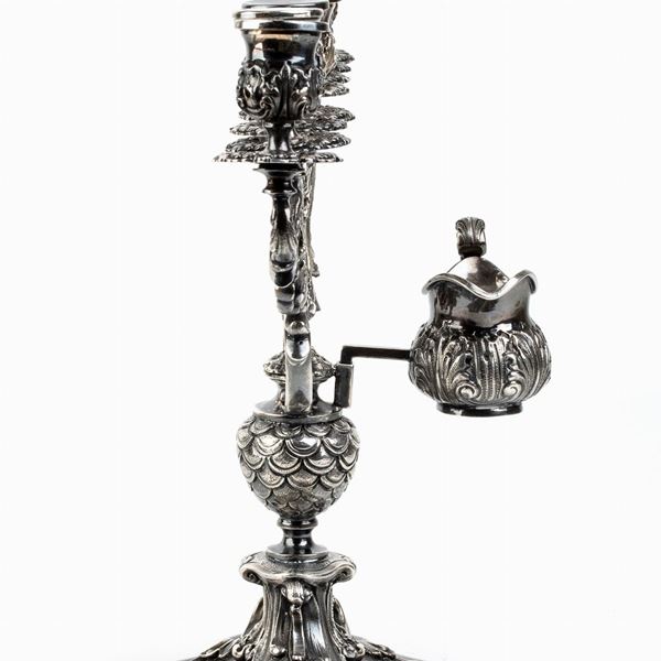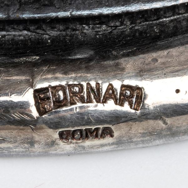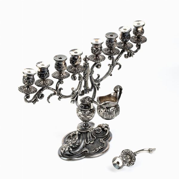 The Chanukkiyah or Hanukkiah is the nine-armed candelabra (eight arms plus the central one to light the other lights). Sterling silver, hallmarked "925 - * 81 MI", silversmith Mario Vallè Milan, dealer Fornari Roma.