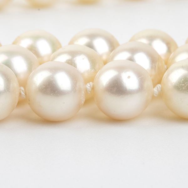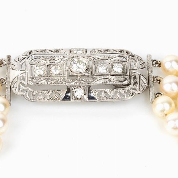 three strands of saltwater cultured pearls, openwork plate geometrical shaped platinum clasp embellished with diamonds. N. 01 round shape brilliant cut diamond approx. 1.60 ct, E-F, SI. N. 06 round shape brilliant cut diamonds approx. 1.05 ct, E-F, VVS-VS.