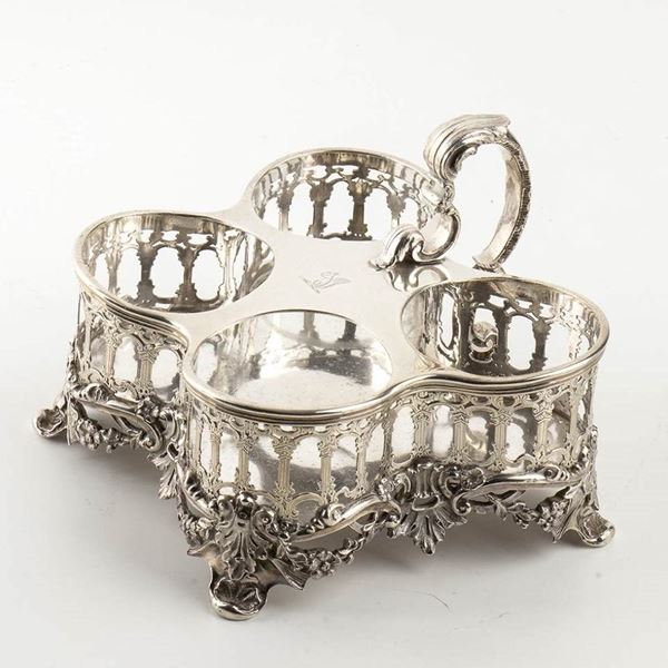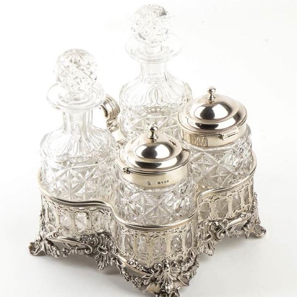 Rare English William IV sterling silver cruet with four bottle stand - London 1836, mark of R J & S GARRARD