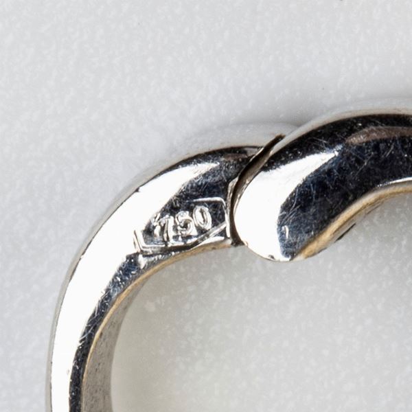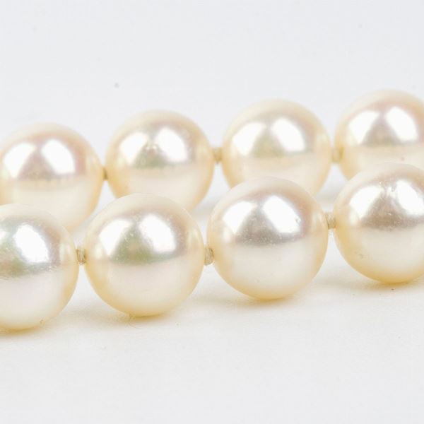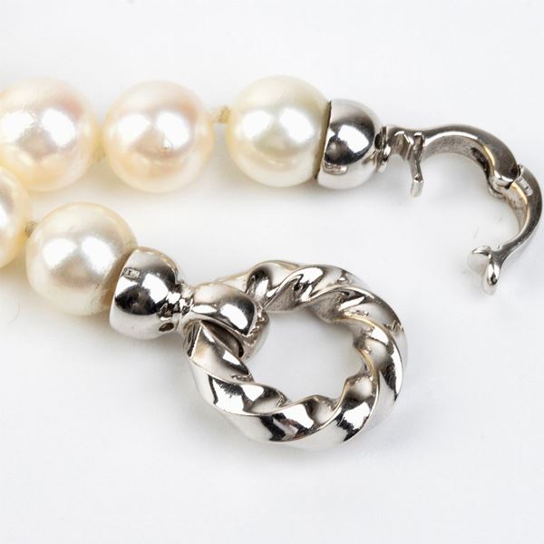 one strand of saltwater cultured pearls with 18k white gold springring clasp. Hallmarked "750". Pearl diameter 8-8.5 mm.