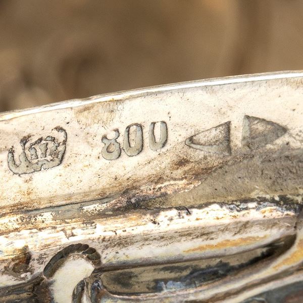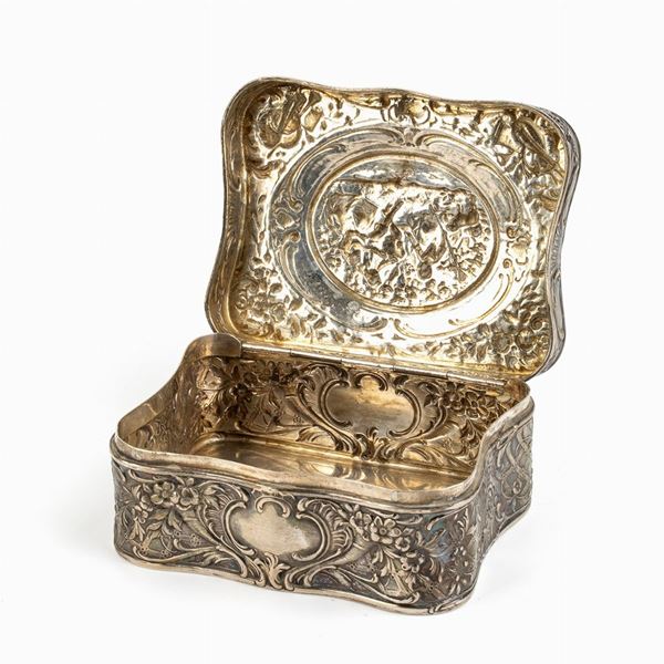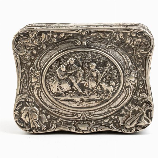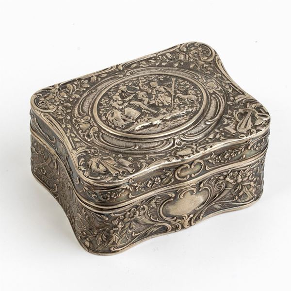 a) rectangular box with shaped edges and floral decoration; hinged lid with genre scene. 800/1000 silver, hallmarked with the marks in use in Germany after 1888.