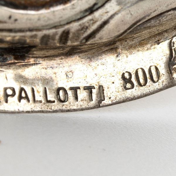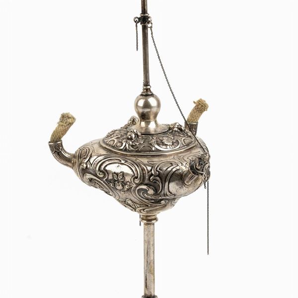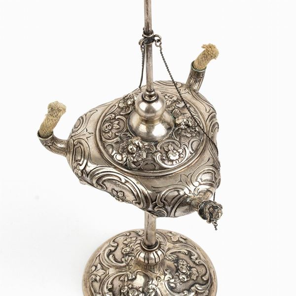 (b) oil lamp with floral decorations and putti. 800/1000 silver, silversmith Pallotti Venezia. Hallmarked '800' and signed 'Pallotti'.