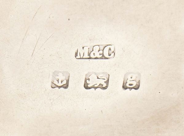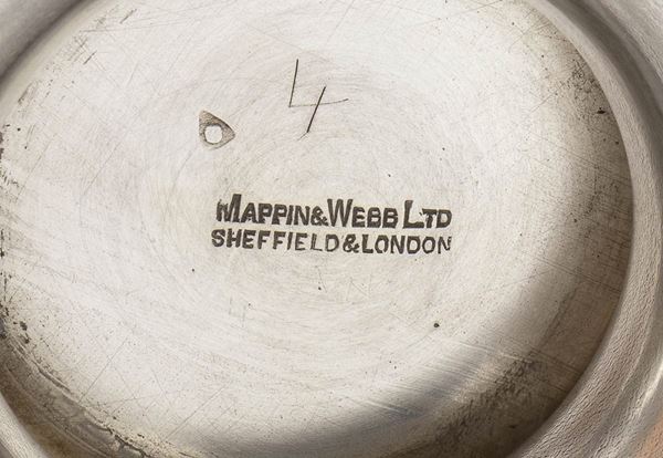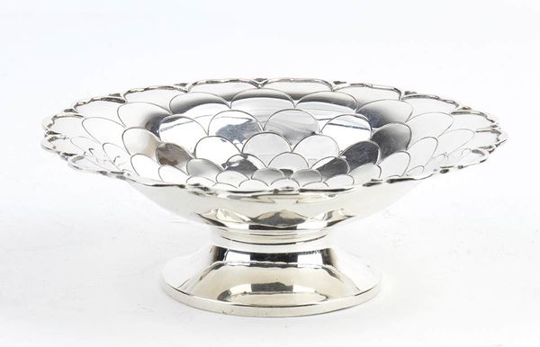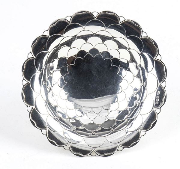 2) of rounded shape decorated with fish scales. Sterling silver, fully hallmarked Sheffield 1933-1934, silversmiths Mappin & Webb. Diameter 12.5 cm, height 4.5 cm, weight 81 g.