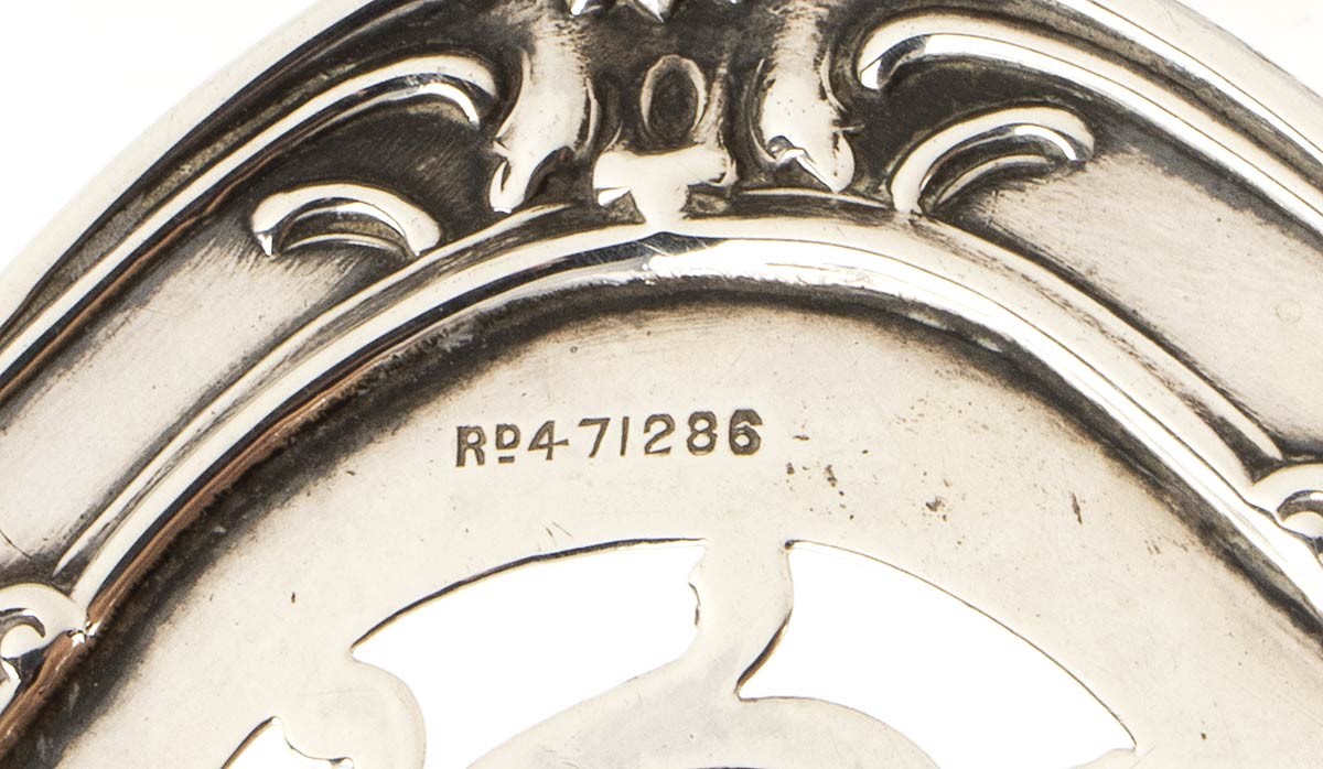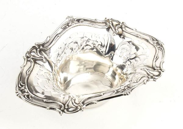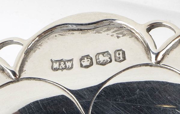 1) of shaped oval form decorated and openwork with vegetal scrolls. Sterling silver, fully hallmarked Birmingham 1906-1907, silversmiths G. M. Milicham & Co. Height x width x depth: 6 x 17.5 x 11.2 cm, weight 102 g.