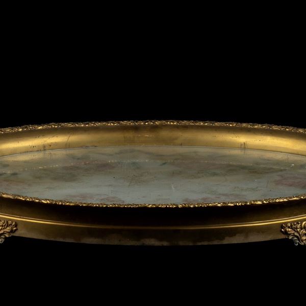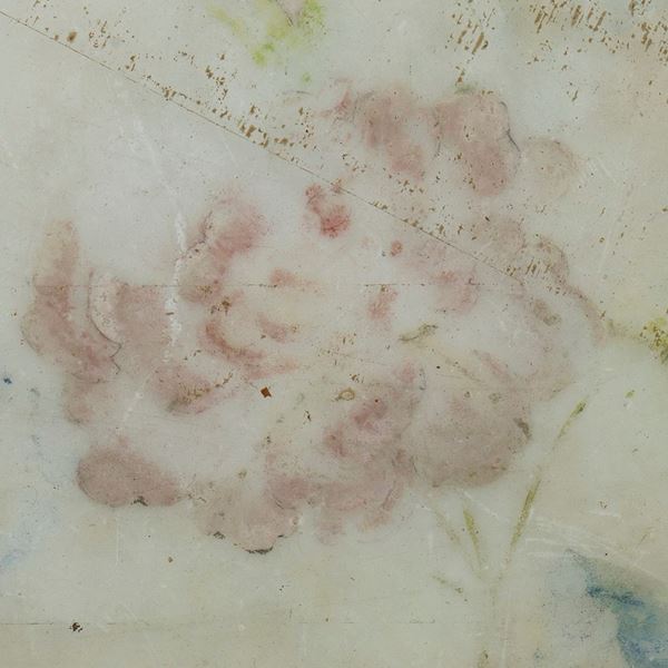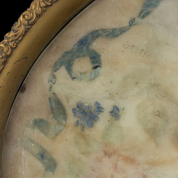 of oval shape with a perimeter border with plant decorations; the marble top, painted in polychrome with flowers and ribbons, is protected by a glass sheet.