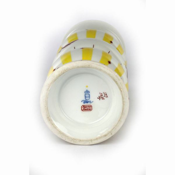 3-ring body with flared base and neck, stylized decoration with vertical bands and leaves. Based on a design by Otto Prutscher, Augarten Vienna manufacture. Blue and red trademarks with author's series numbers and underglaze decorator at the base.