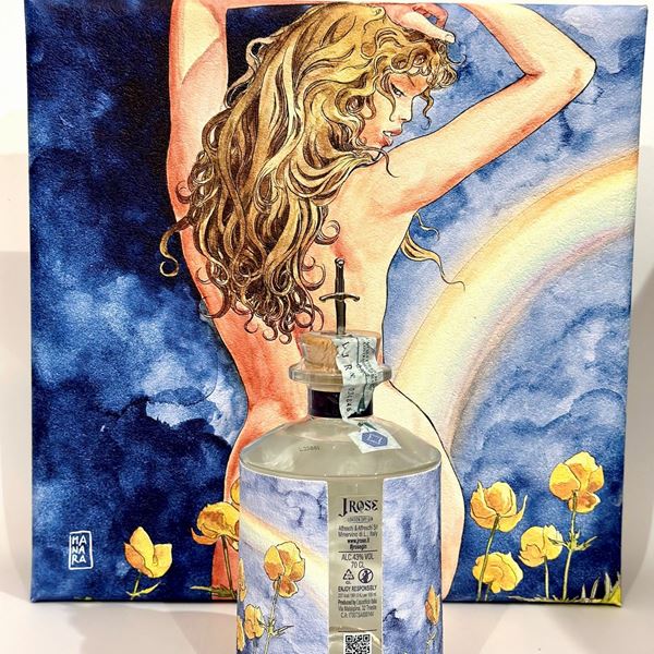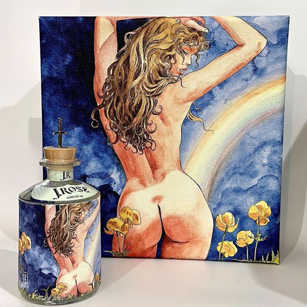 Italia, Gin 75 cl. - 43% vol.Livello: entro il collo (WN).Confezione: scatola originale (OC).Condition report: etichetta e capsula in perfette condizioni.Note: lotto comprensivo di 2 bicchieri, la scatola diventa un opera di Milo Manara.