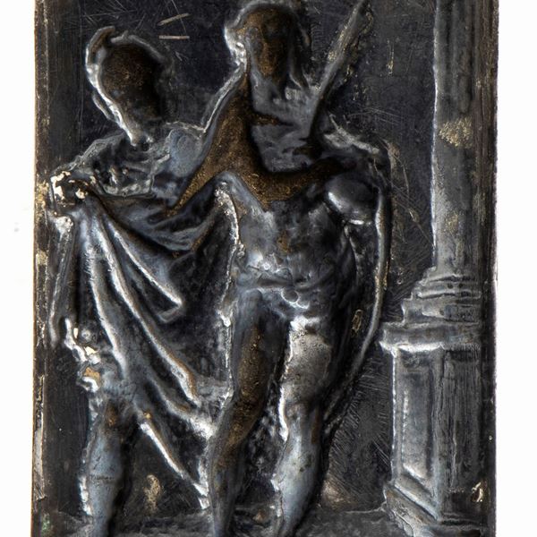 In the center, full-figure Jesus Christ in a loincloth and a long cloak on his shoulders, a crown of thorns on his head and his arms crossed and tied in front, holding the flail in his right hand. At his side, a Roman soldier holding his cloak. On the left, column with a base.