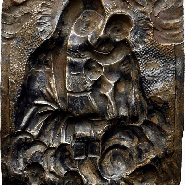 The Madonna on a cloud with Child in her arms, in her left hand holding two scapulars; on the sides two cherubs; below three male figures among fire flames. Dotted background, on the left 3 goldsmith's hallmarks. very good quality with small cracks on the foil.