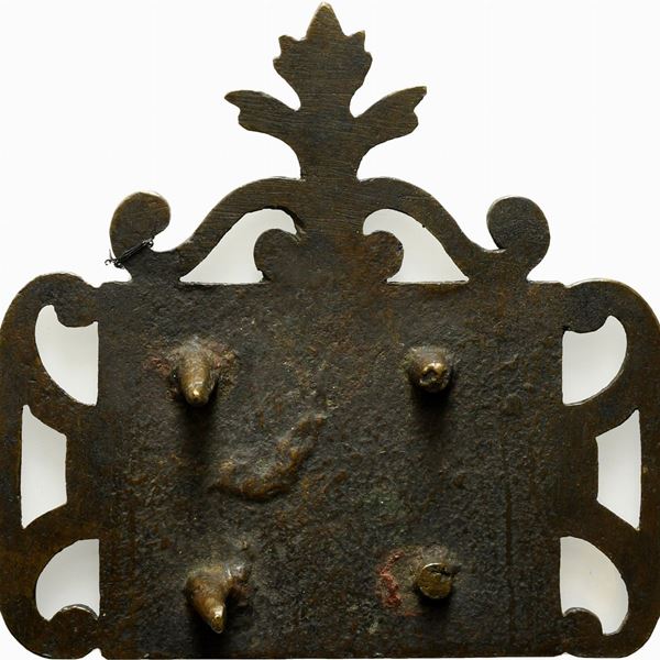 Scene with four warriors armed with swords and shields entering a city, at the gate another warrior exits the city?. Carved frame. Fine antique casting.