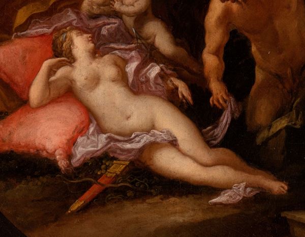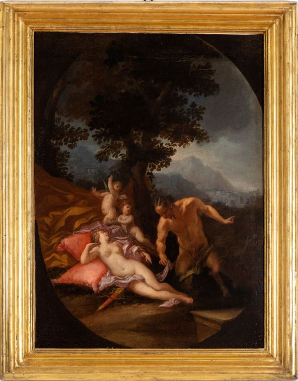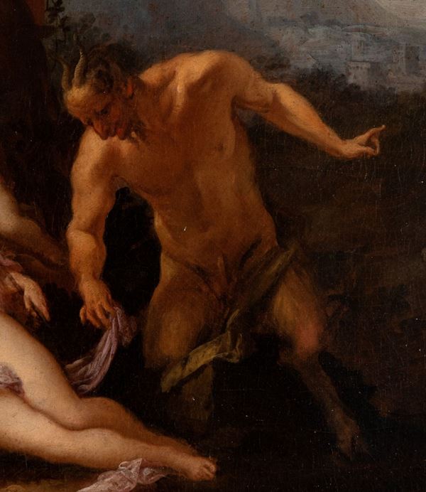 In this image with transparent erotic connotations we recognize a harmonious combination of pictorial stimuli from different sources: from Poussin to Lorrain, from Mola to Dughet, from Garzi to Lauri. Within this skilful mixture, firmly anchored in the Roman figurative culture of the second half of the seventeenth century, the name of Filippo Lauri in particular stands out in the most stringent terms, of whom significant affinities can be found here in the conception of the landscape, and of the relationship between landscape and figures, in the warm and luminous coloring, in the Correggesque softness of the flesh tones and in the sensually decorative intonation, which prelude to the developments in the Rococo sense of Roman painting embodied by the painting of Michele Rocca: One need only think of Lauri's masterpieces such as the pair of canvases Jupiter and Io and Venus and Cupid at the Weston Park Foundation, or the Apollo and Marsyas at the Dulwich Picture Gallery in London.