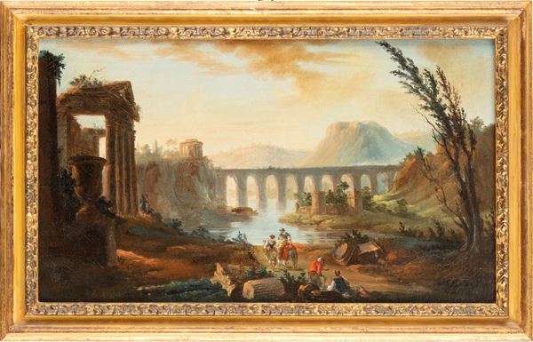 Ideal Latium view with ruins, corinthian temple, circular temple, aqueduct and figures