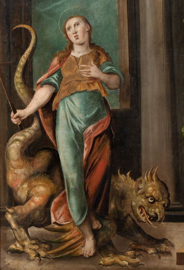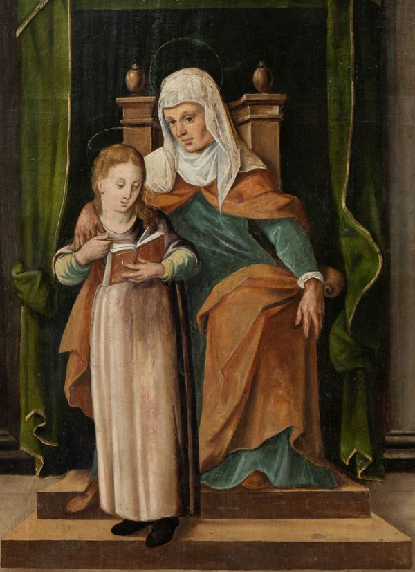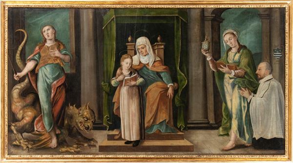 The education of the Virgin with St. Anne enthroned before St. Margaret of Antioch, St. Magdalene and the donor in cassocks