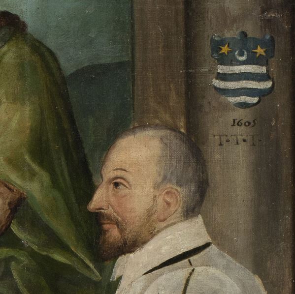 The painting bears on the column in the right margin of the canvas behind the donor coat of arms, date initials: "1605 / T.T.".