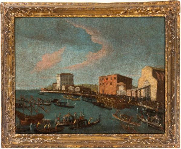 The painting represents the favourite theme of 18th century vedutists: the procession following the "Sposalizio del Mare" to San NicolΓ² on the Lido. The Doge aboard the Bucintoro, reached the mouth of the Lagoon, with a sumptuous procession of boats in tow, and threw a golden ring into the water. In this work we recognise the simple and almost impersonal narrative register typical of Gabriel Bella, who depicts the event like a chronicler in a naive and charming pictorial style.