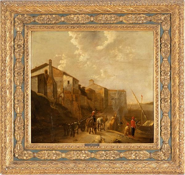Of this uncommon view of Rome with the landing of boats at the port of Ripa Grande, Jan Both executed at least two versions: the one presented here and another, of similar size but developed in a more rectangular sense, preserved at the Städelsches Kunstinstitut in Frankfurt. The composition, apart from the slight difference in format, which causes differences concentrated essentially on the right side of the scene and on the sky track (more extensive and cloudy in our version), is very similar, with the same buildings and the same typical repertoire of wayfarers, vagabonds and peasants that always animates Jan Both's anti-aulic and pauperistic Rome.