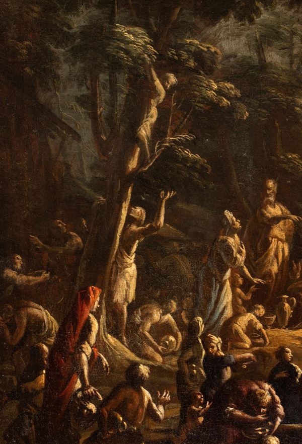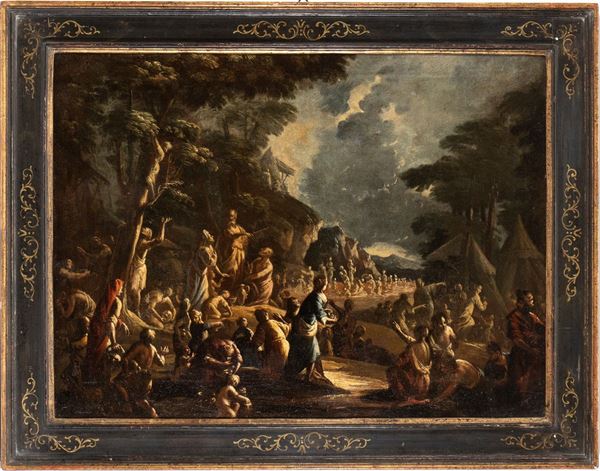 This fine unpublished painting constitutes, in our opinion, a significant addition to Micco Spadaro's catalog, in the relevant segment of his production related to paintings of sacred subject of private destination. We have here an essay of Gargiulo's predilection and renowned virtue in the invention of scenes teeming with figures, rendered with brilliant dynamism and refined variety of poses and attitudes, as well as as an imaginative landscape painter. As terms of comparison within the painter's catalog one can point out here, among others, the en pendant pair with Moses and Aaron collect offerings and Moses makes water spring from the rock in a private Neapolitan collection (Sestieri - Daprà, nos. 153-154, pp. 304-305) or the Preaching of the Baptist, also in a private Neapolitan collection (Id., no. 167, pp. 319-320).