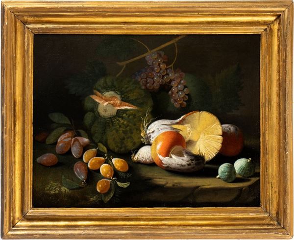 Still life of mushrooms, figs, grapes, pumpkin and plums